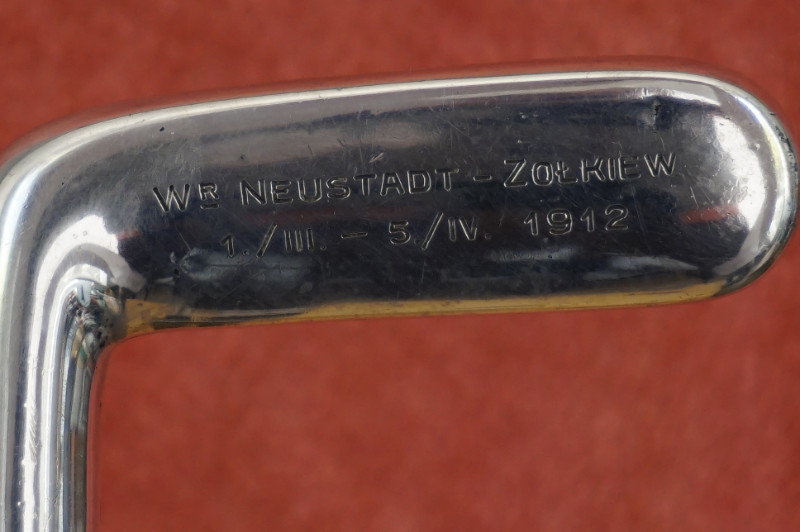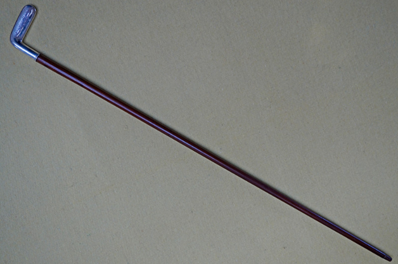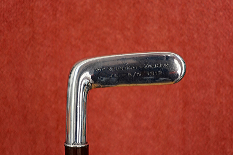 The handle has been modelled to imitate a golf club, it is 7 cm high x 8,5 to the side x 1,5cm at his widest. One of the sides is marked and dated WR NEWSTADT – ZOLKIEW 1/III – 5/IV 1912. Two cities of the Austrian Empire. At the other side, it is personalized with the signatures of three members of the event, the calligraphy extraordinary engraved on the silver, by the collar are the Austrian maker’s marks. Exotic wood for the shaft and a metal ferrule, the O.L. is 89 cm. without chips or cracks, only minimal traces of wear, the condition is perfect.