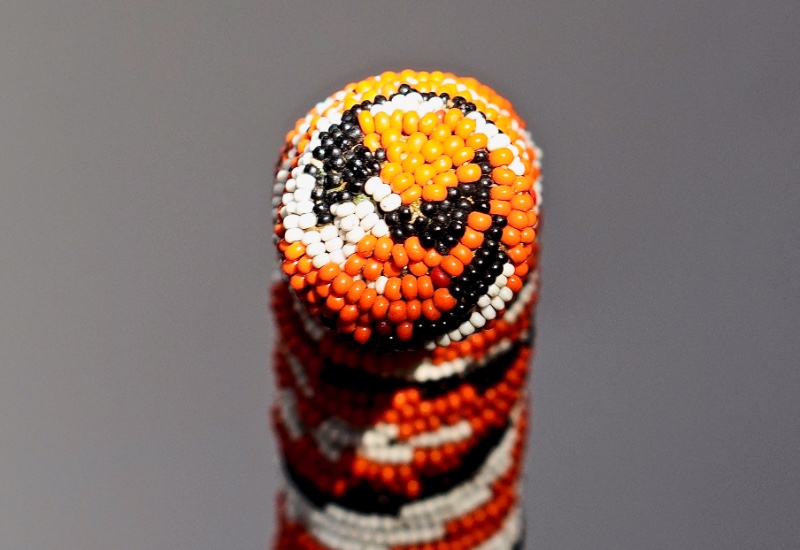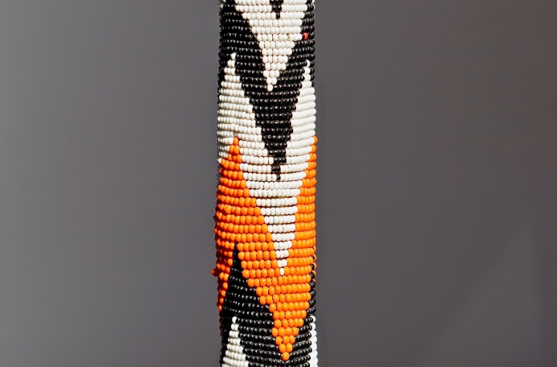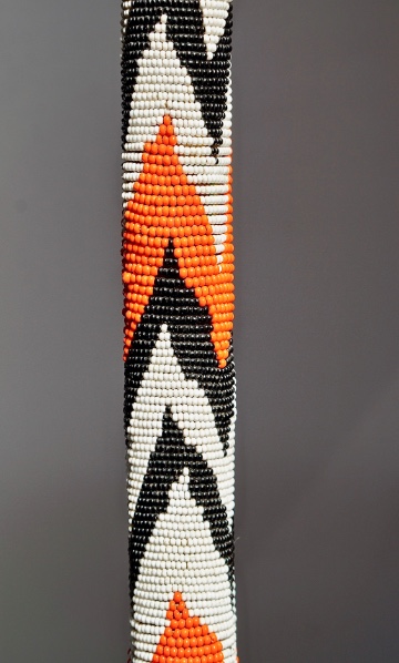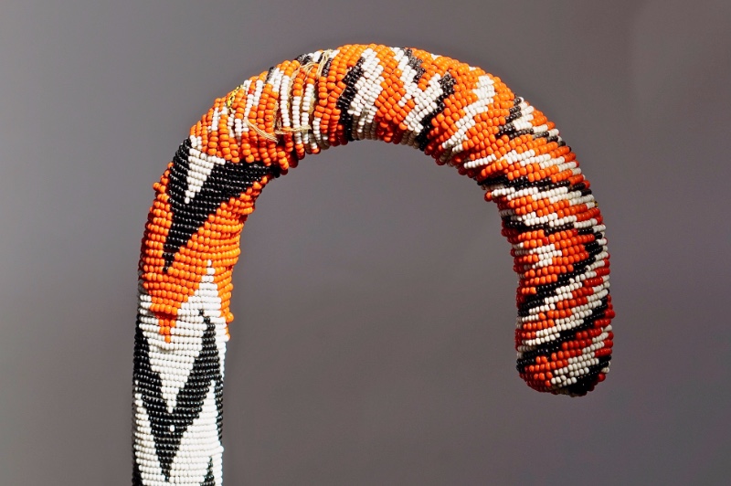 The crook handle is 14 cm high x 16 cm to the side x 4 cm thick. It is possibly has been produced by the Maasai during the early to mid-twentieth century. It shows a bead design en zigzag wrapping the entire wooden-surface using three colours of beads: orange, black and white. The task has been quite laborious because the shaft tapers down, the zigzag peaks are faultless sharp and all of it fits perfectly even having irregular widths. The OL is 95 cm and 98% of the beadwork has survived over time intact. The condition is excellent.